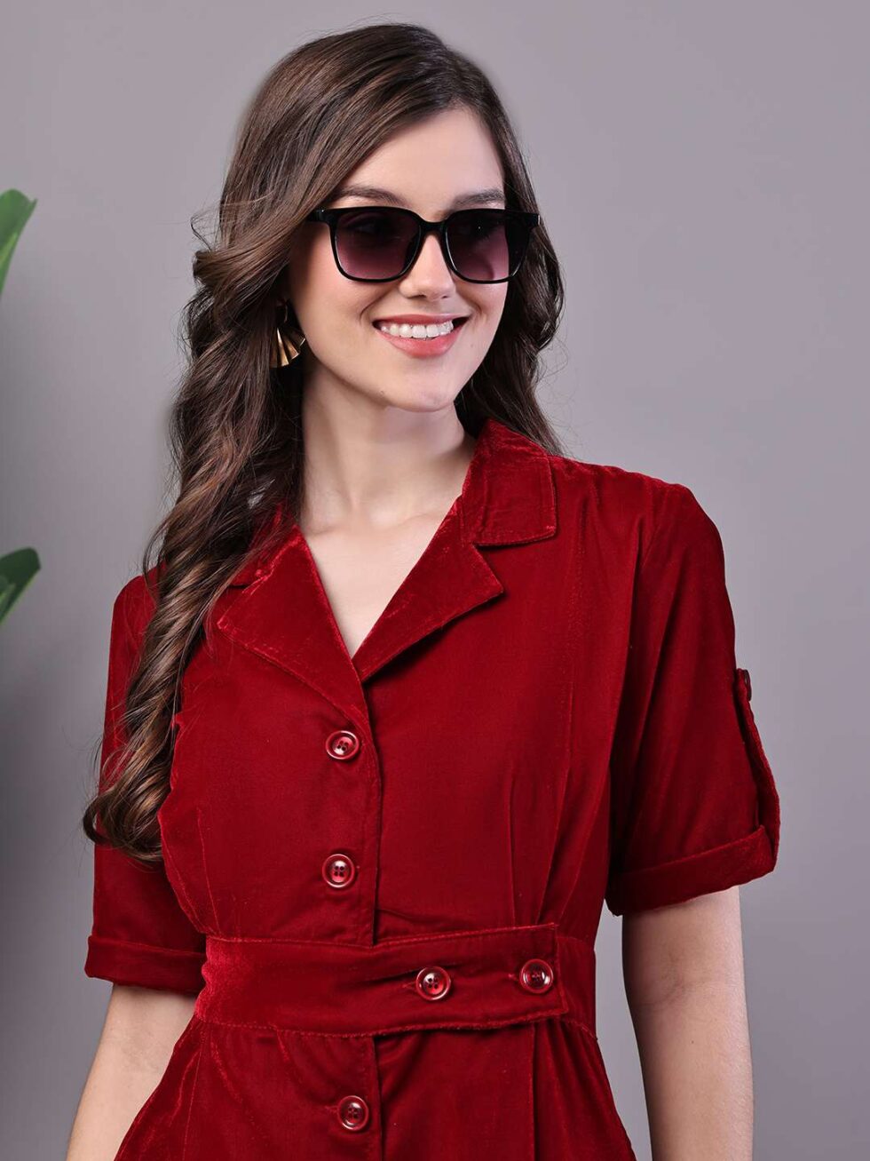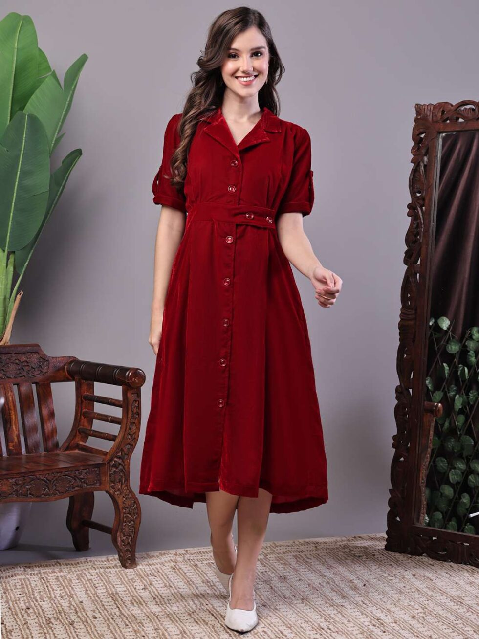 Be the first to review “Women’s Maroon Velvet Solid Printed Shirt Midi Dress with Belt”
